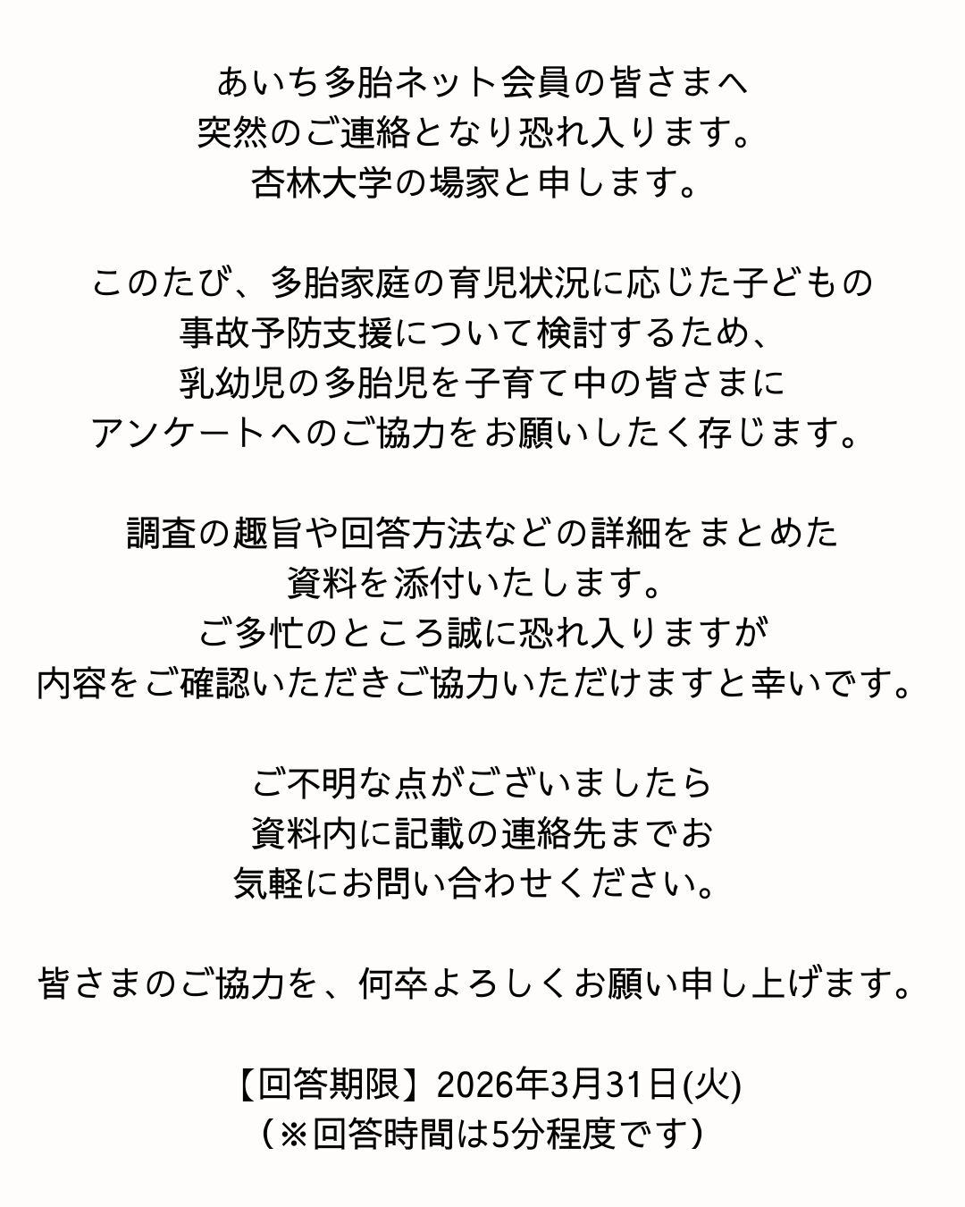 杏林大学保健学部看護学科看護養護教育学専攻 場家美沙紀先生より『乳幼児の事故発生リスクとその関連要因-単胎児家庭と多胎児家庭における保護者の認識の比較』というテーマでアンケートによる調査協力依頼が届いております📒