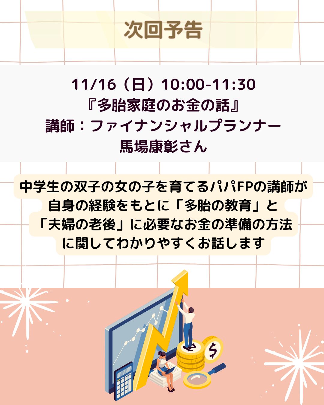 次回は11/16(日)10時~「多胎家庭とお金の話」です。