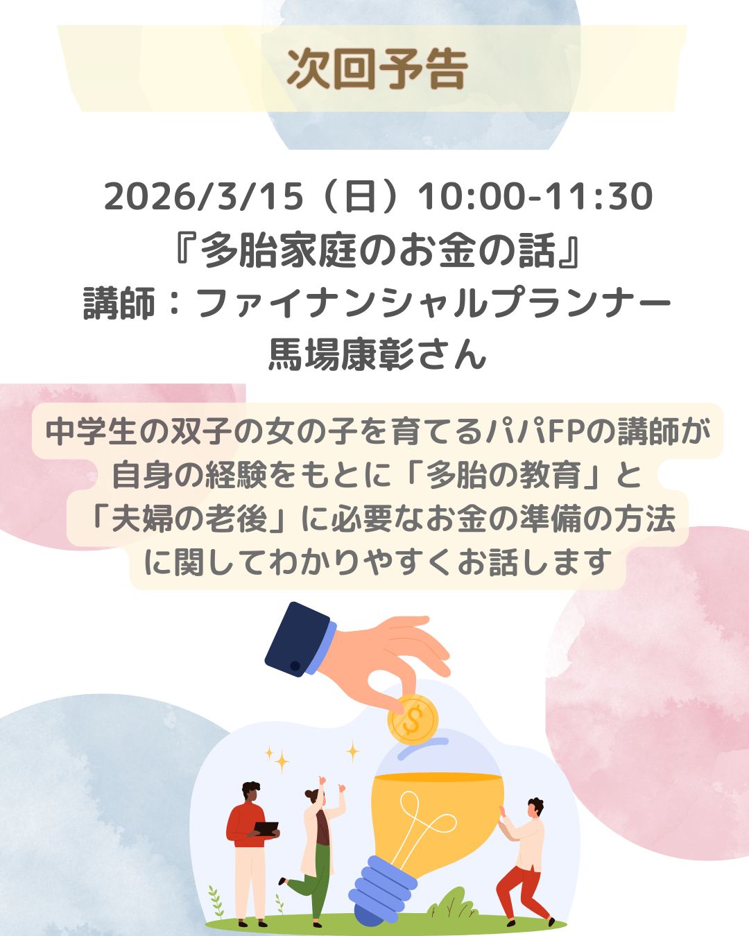 次回のオンライン多胎家庭交流会は3/15(日)「多胎家庭のお金の話」です。