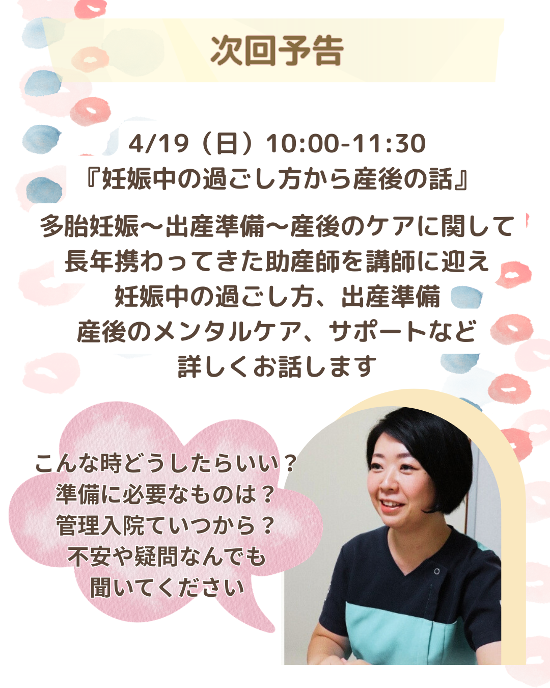 次回のオンライン多胎家庭交流会は4/19(日)「妊娠中の過ごし方から産後の話」です。