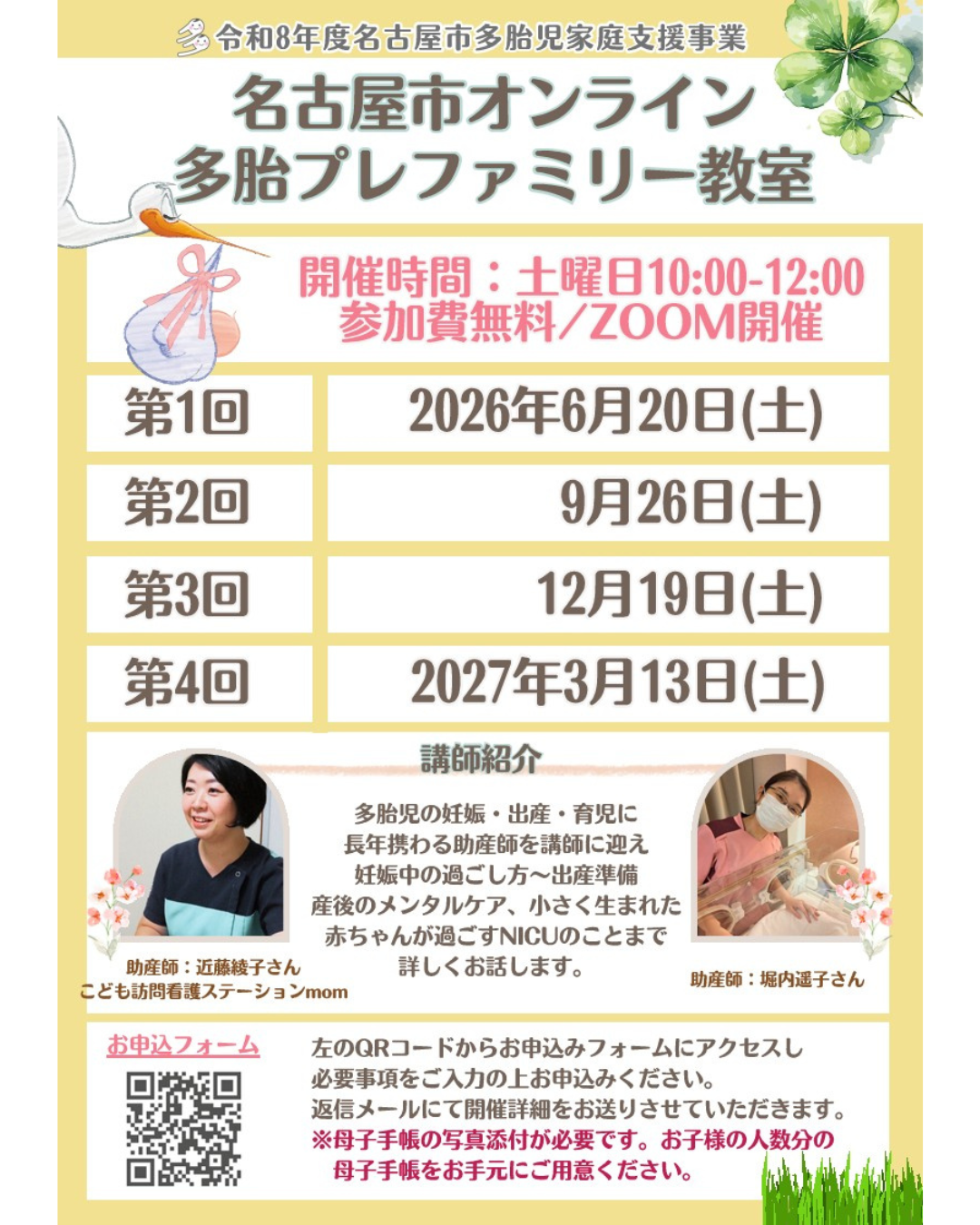2026年度の『名古屋市オンライン多胎プレファミリー教室』のスケジュールのお知らせです💛